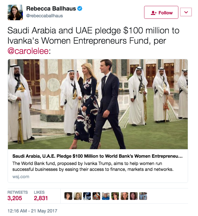 This weekend, the Wall Street Journal‘s Carole Lee wrote a perfectly accurate story about Saudi Arabia and the United Arab Emirates pledging to donate $100 million to a World Bank fund for women entrepreneurs. The article noted that the fund was Ivanka Trump’s idea and that she was at the event where the pledge was announced.When Wall Street Journal reporter Rebecca Ballhaus tweeted out a link to her colleague’s story, she spun it in such a way as to add inaccuracies. First she reclassified a World Bank fund as a fund belonging to Ivanka Trump.